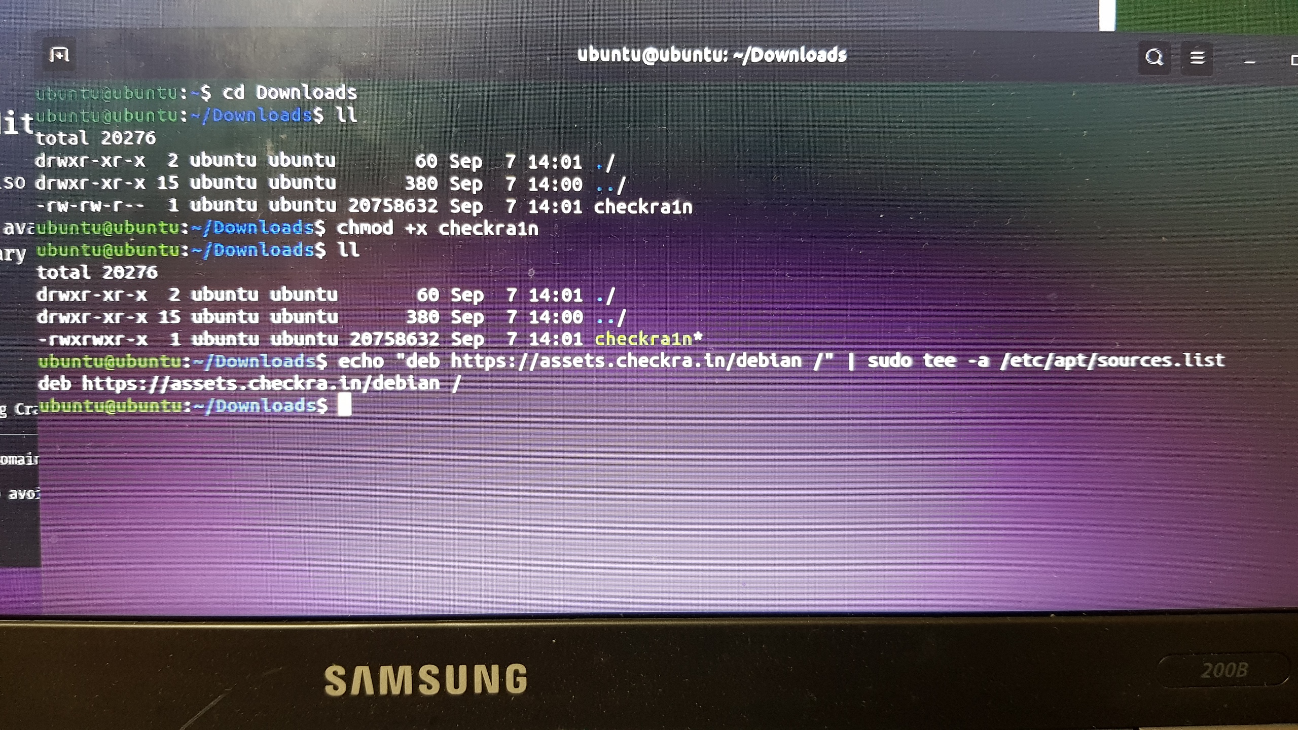 터미널에서 cd Downloads 를 입력하여 Firefox 에서 다운 받은 파일이 있는 위치로 이동한다.