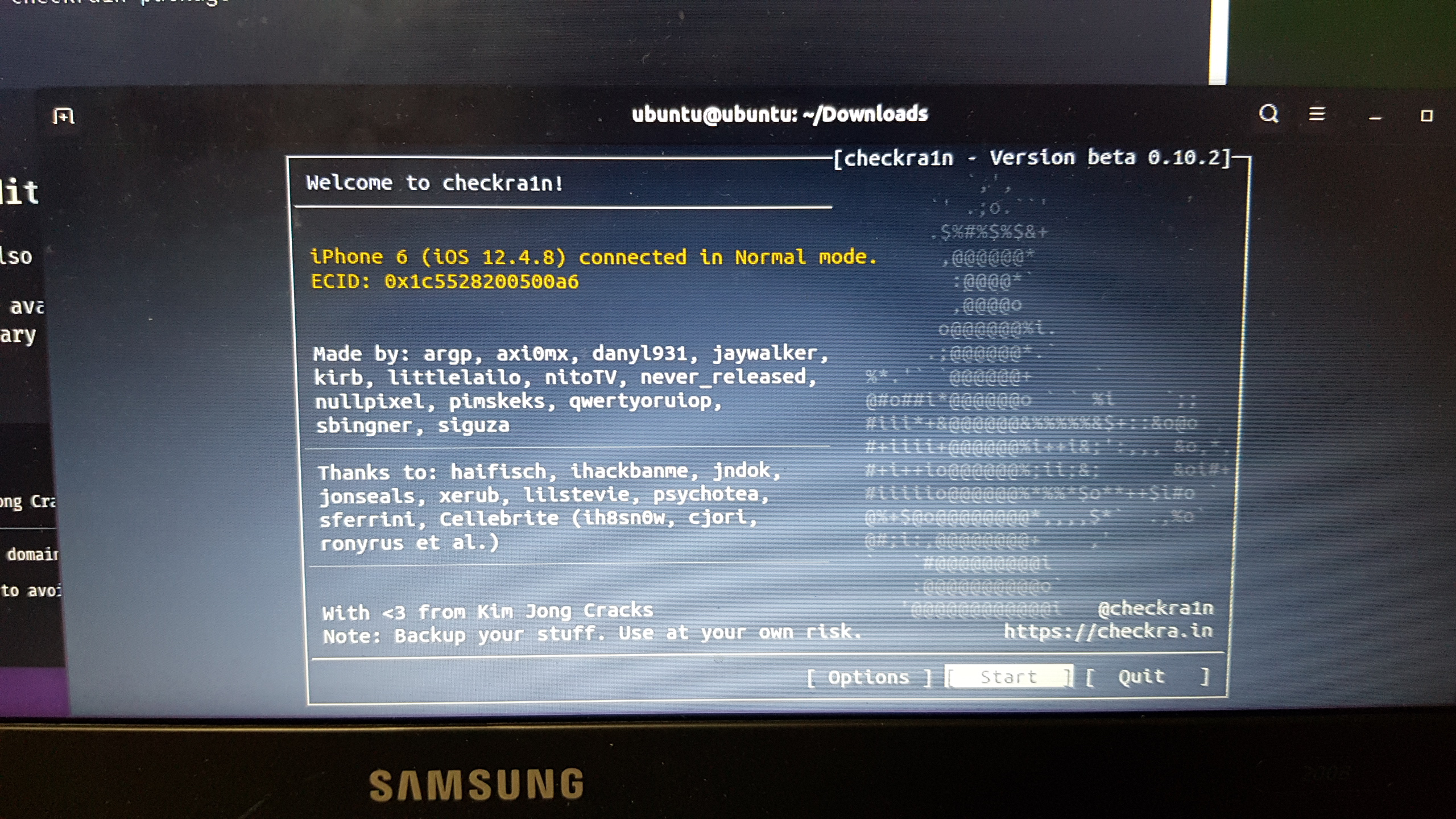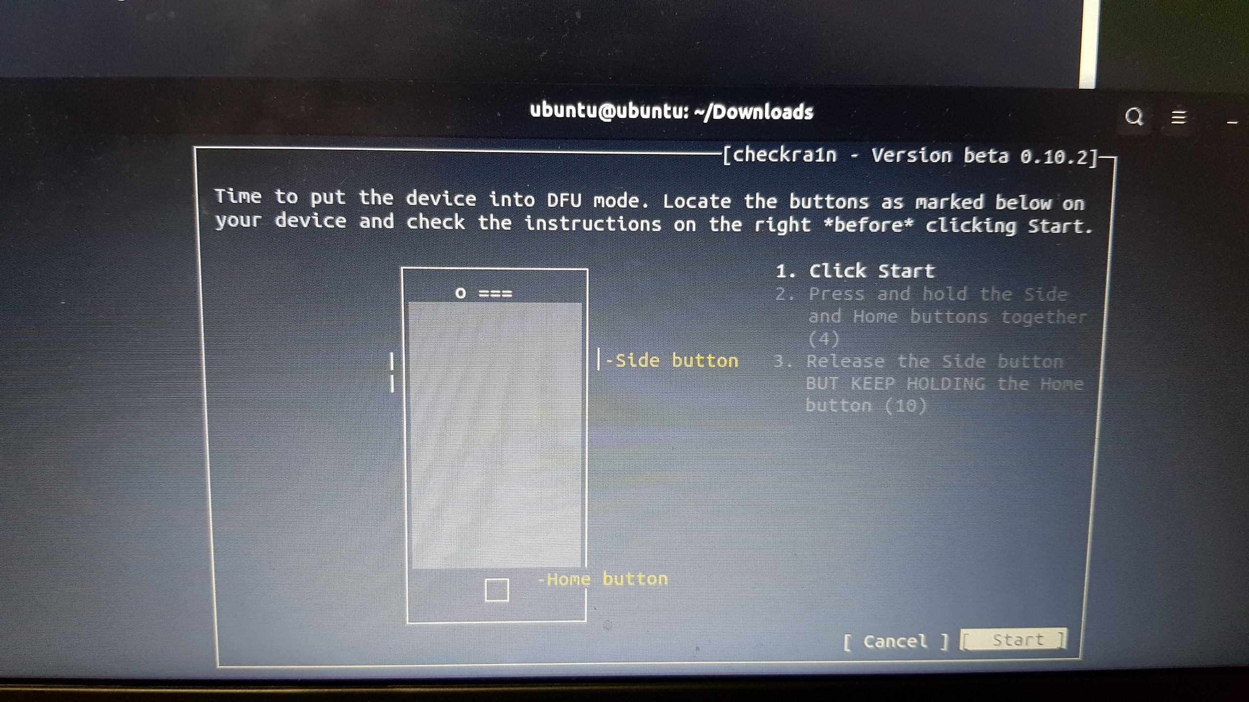 Checkra1n 실행하기 위한 옵션설정이 종료 하였다면 화살표를 눌러 “ Start “를 선택 하여 엔터로 실행 한다.