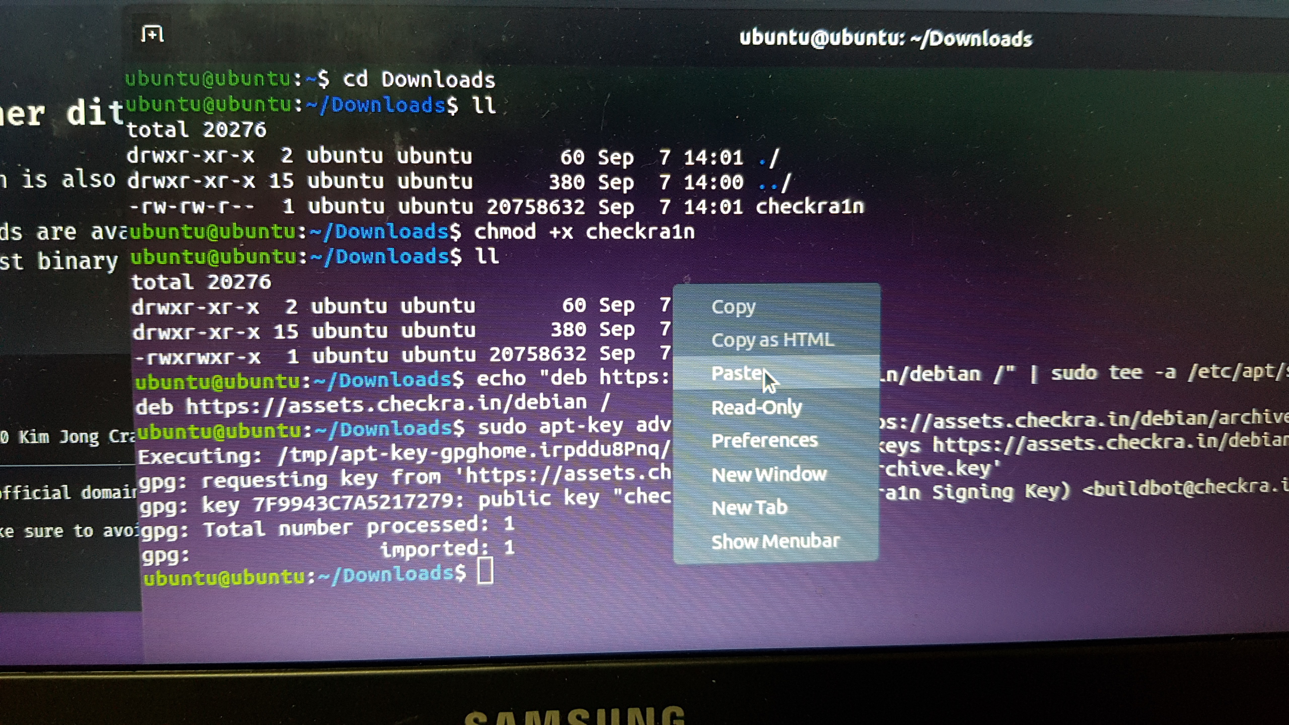 다시 터미널로 돌아와서 마우스 우클릭 메뉴의 붙여 넣기를 선택 하고 엔터를 눌러 실행한다.