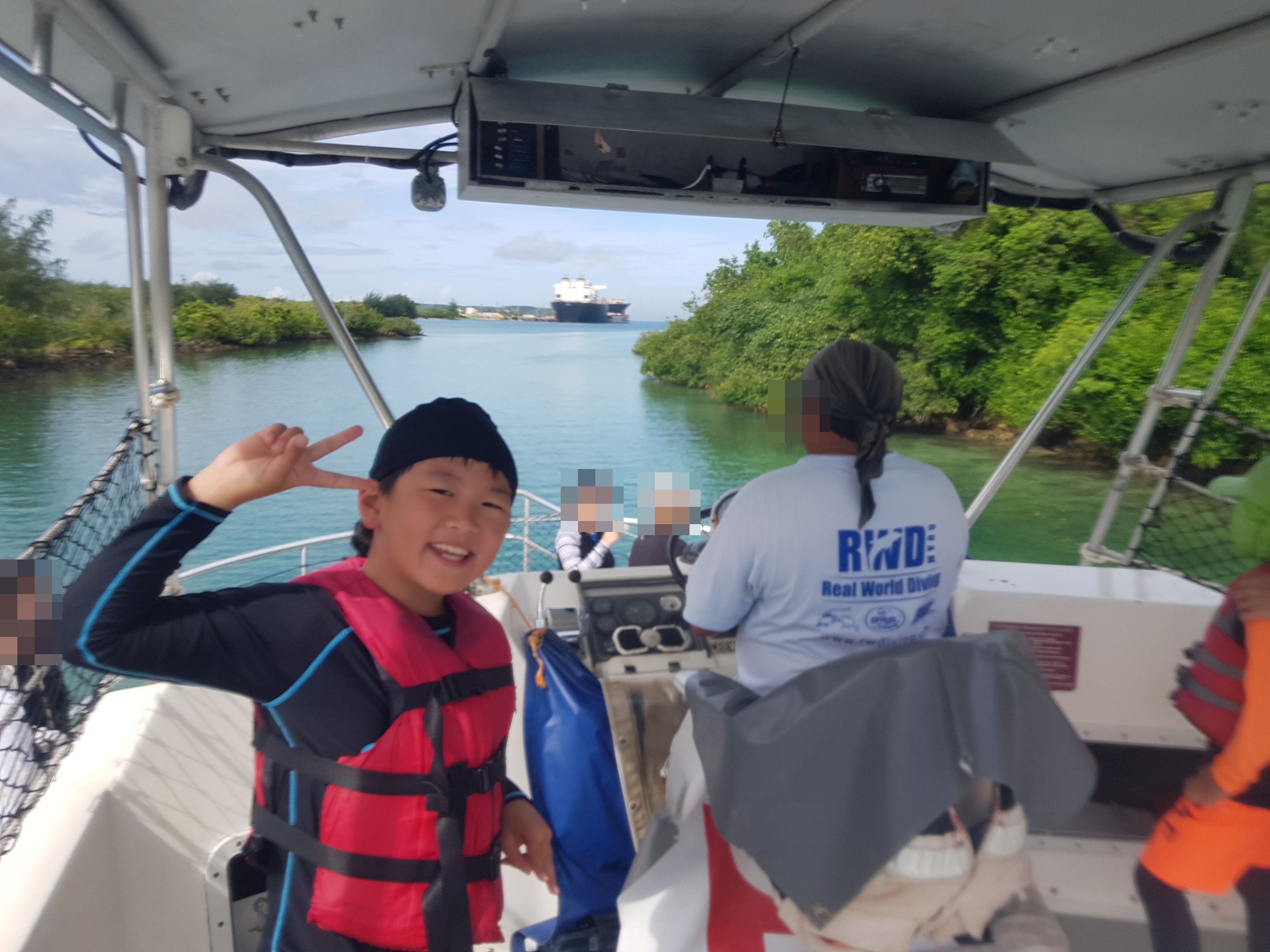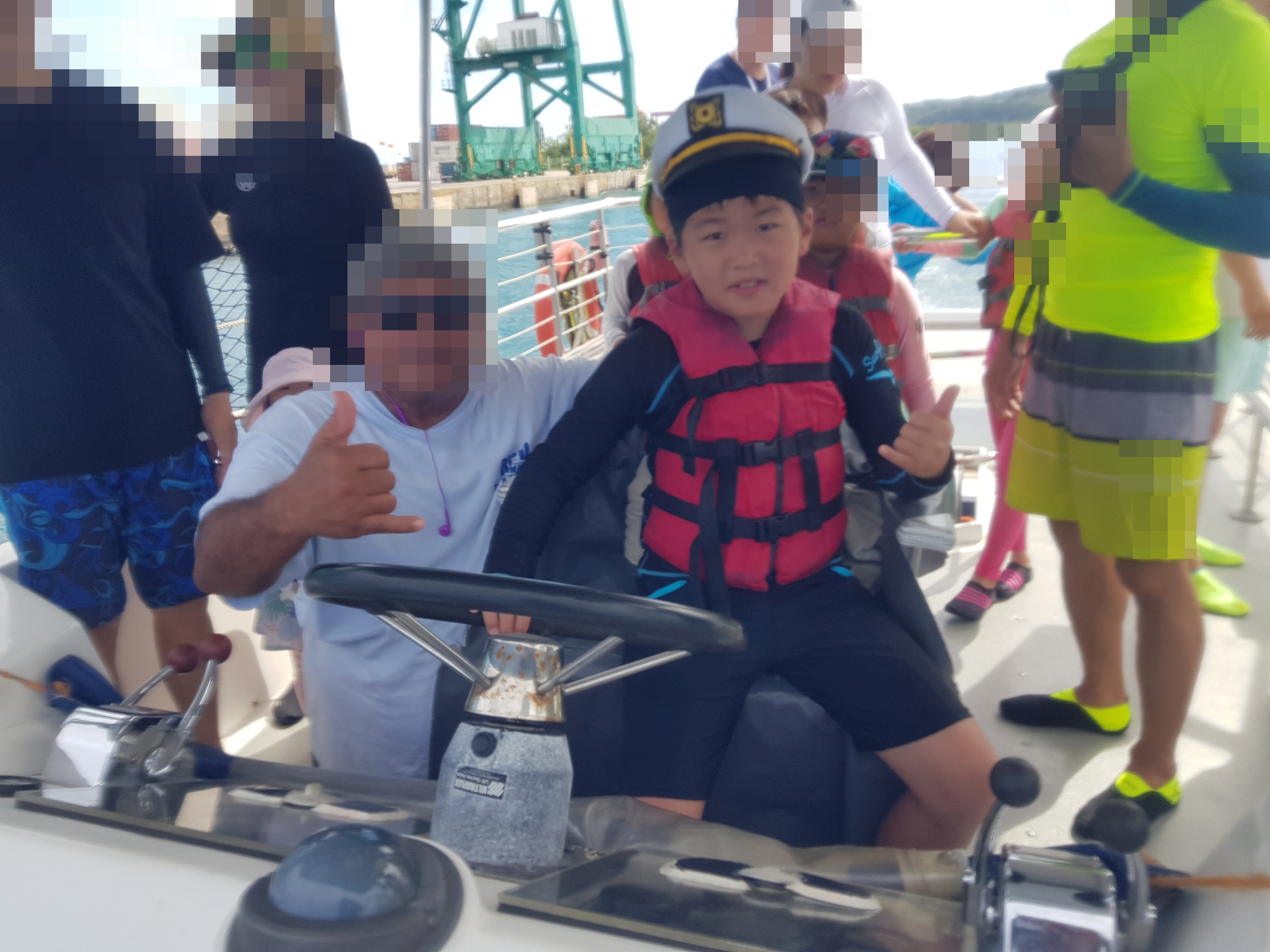 배가 어느 정도 안정적인 곳 까지 다다르자, 아이들에게 캡틴 모자를 씌워 키를 잡고 사진을 찍는다.