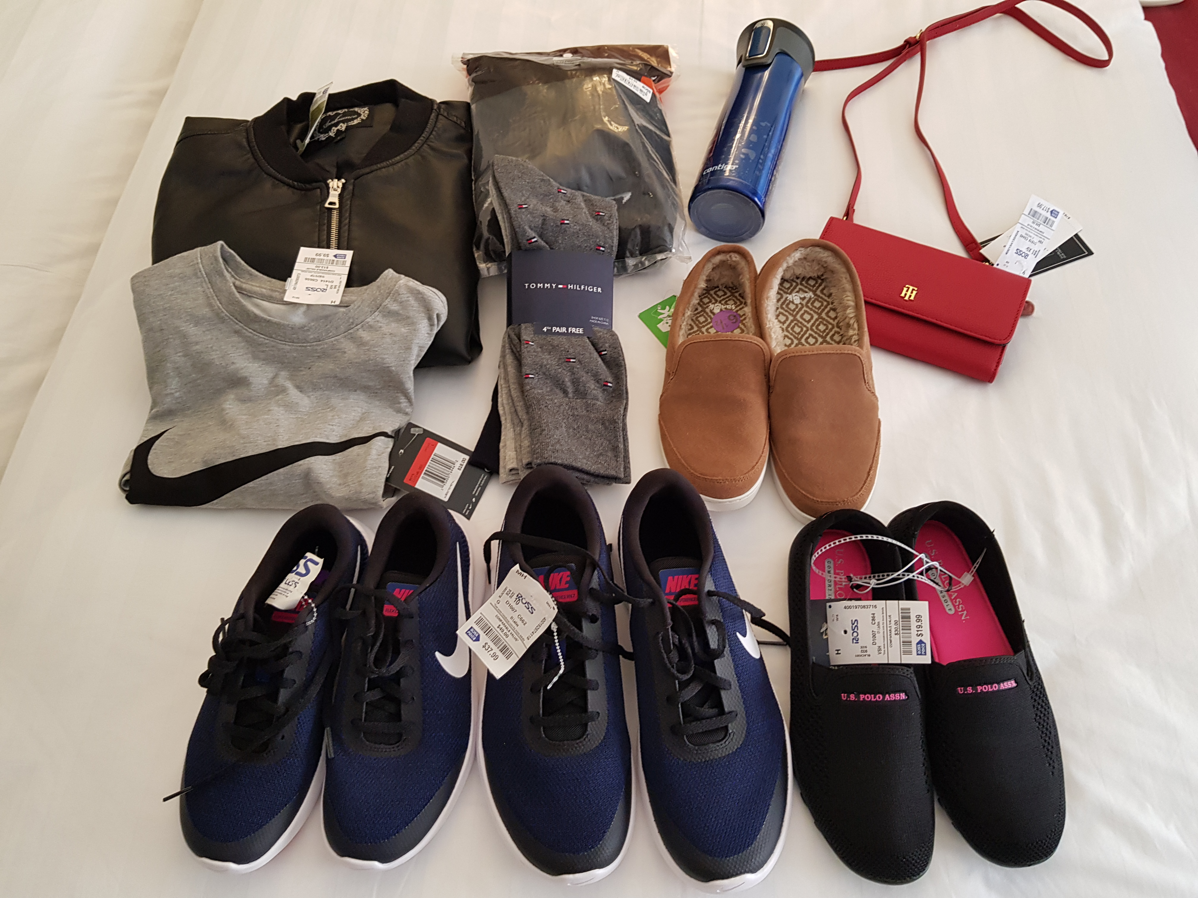 가죽재킷 9$, 핸드백 18$, 여성 단화 10$, 아들과 같이 신을 운동화가 각 38$ 등