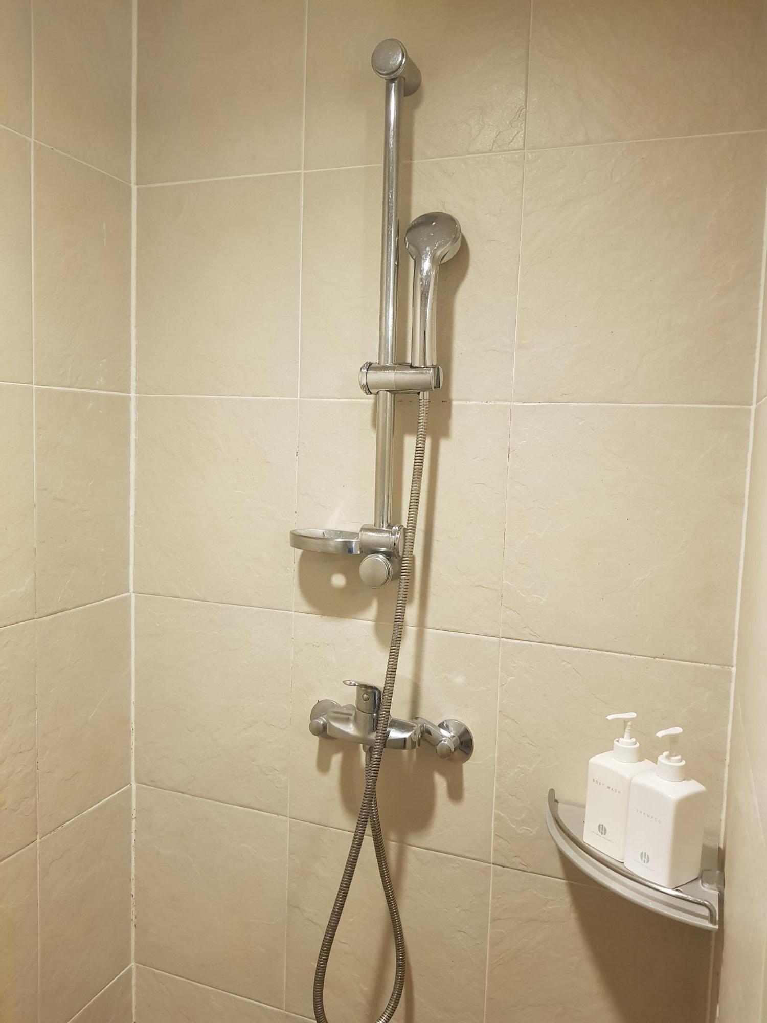 샤워 부스에는 샴프와 바디샴프만 준비되어 있고, 샤워기만 구비되어 있다.