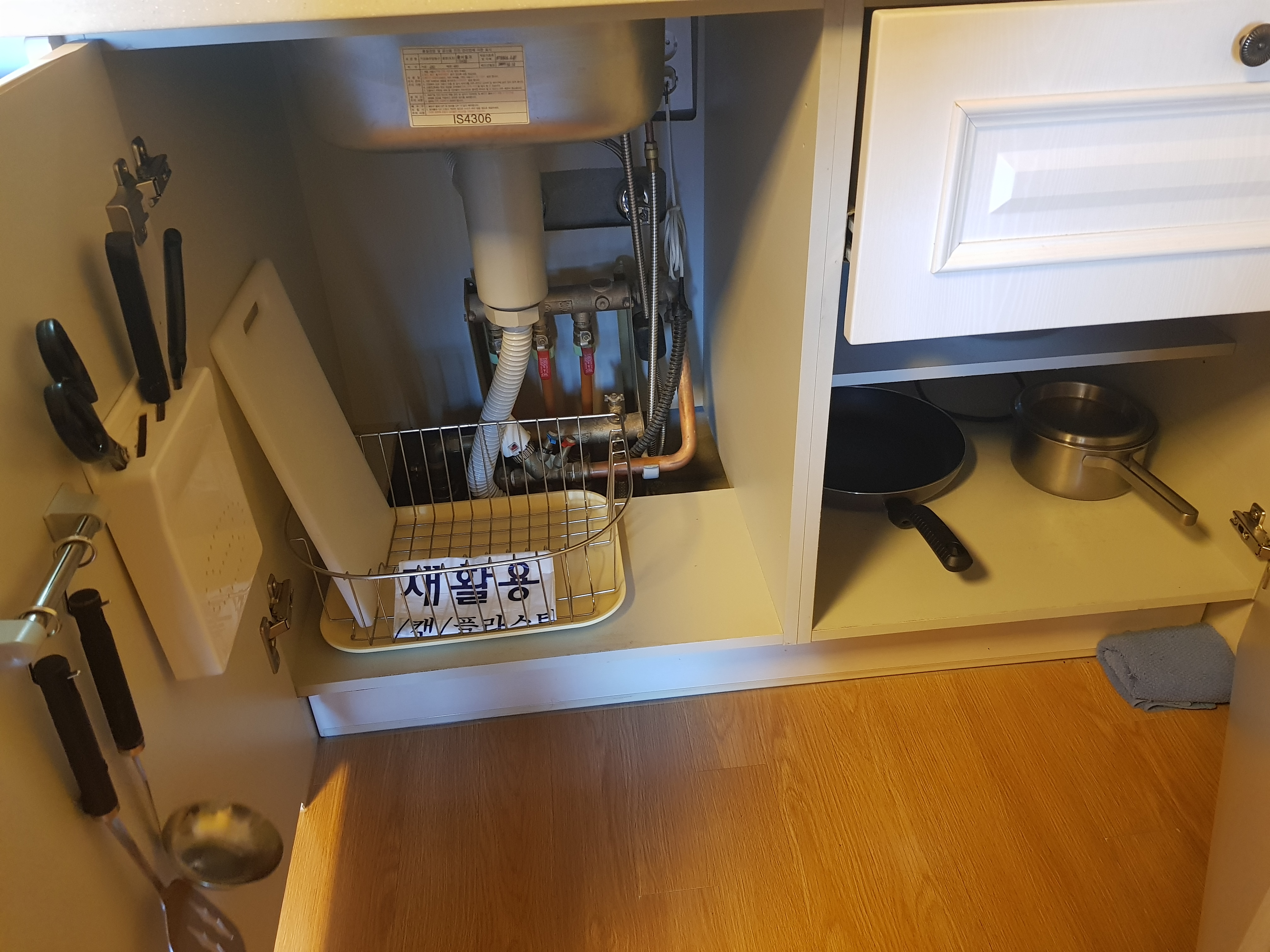 싱크대 아래 쪽에 취사에 필요한 칼, 국자, 냄비등이 숨겨져 있다.