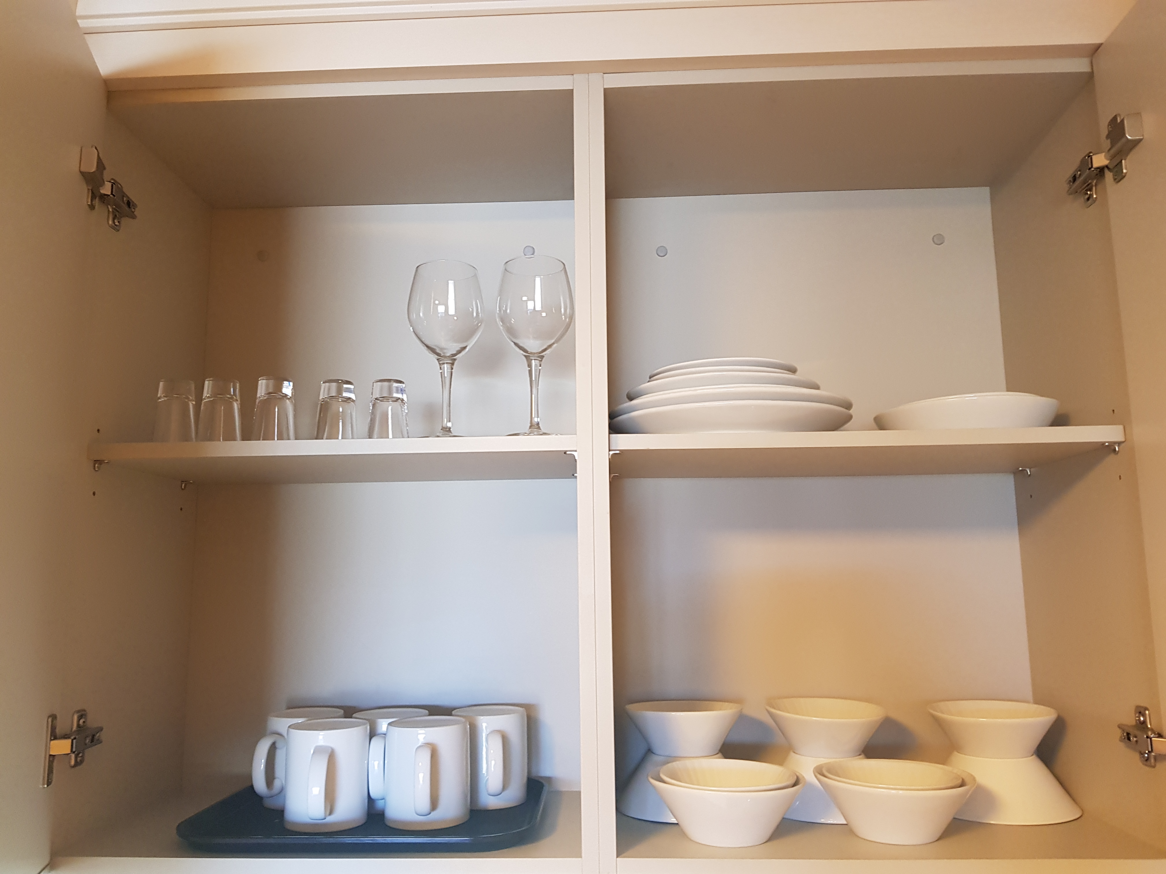 5인용에 맞게끔 각 식기류들이 찬장에 깔끔하게 정돈되어 구비되어 있다.