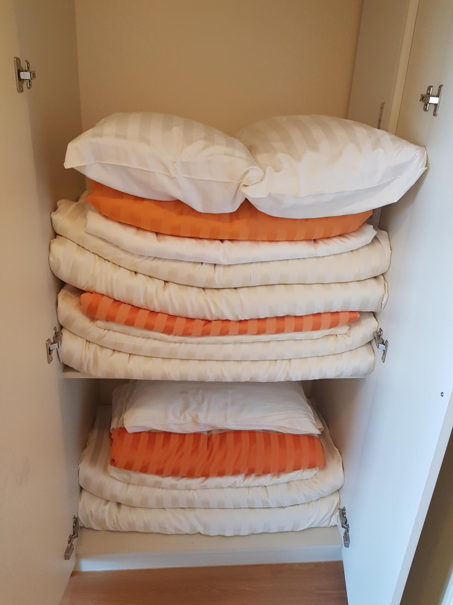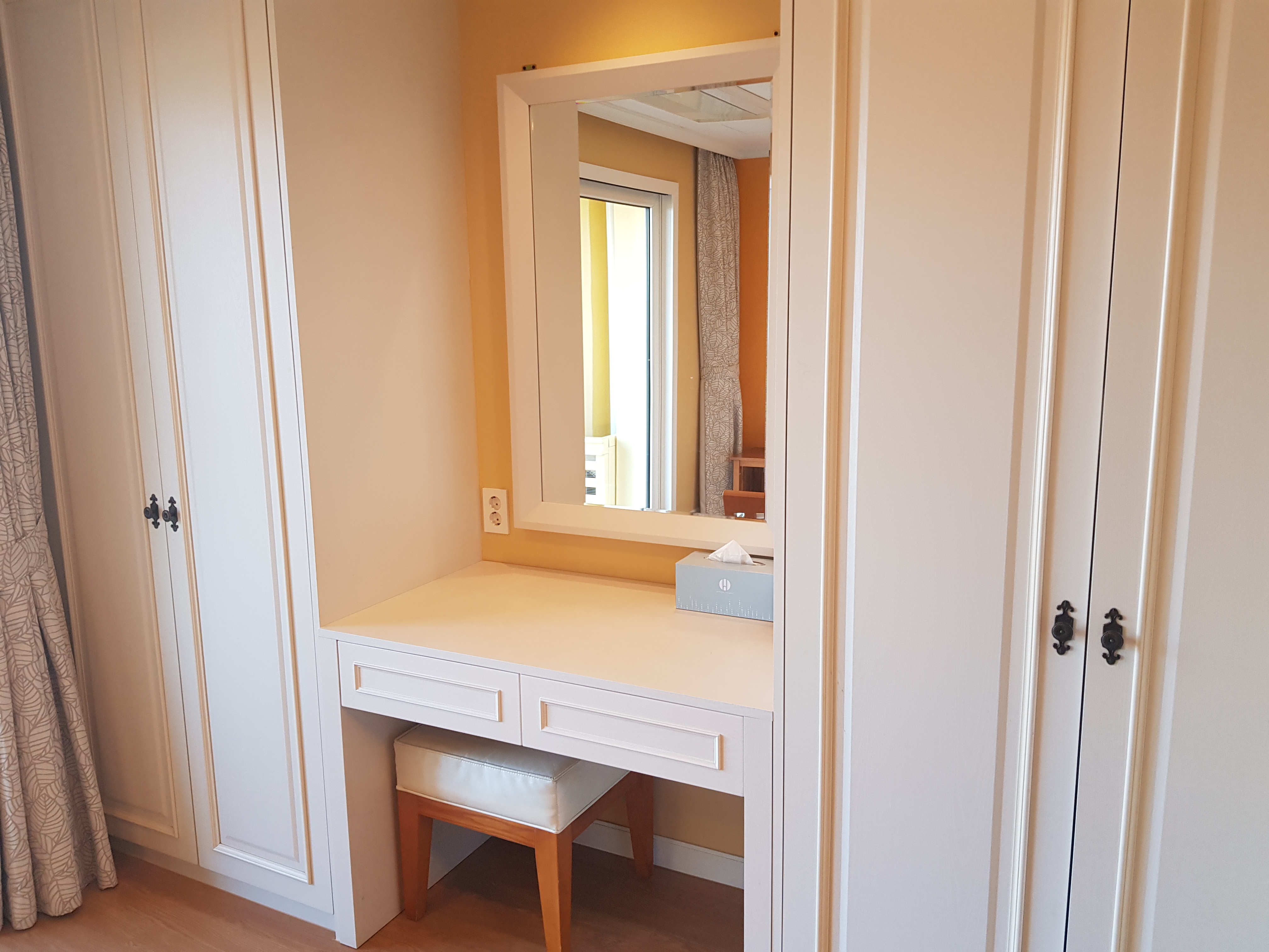 침대 끝 쪽의 벽에는 옷장과 화장대, 그리고 추가로 사용할 수 있는 이불들이 마련되어 있다.