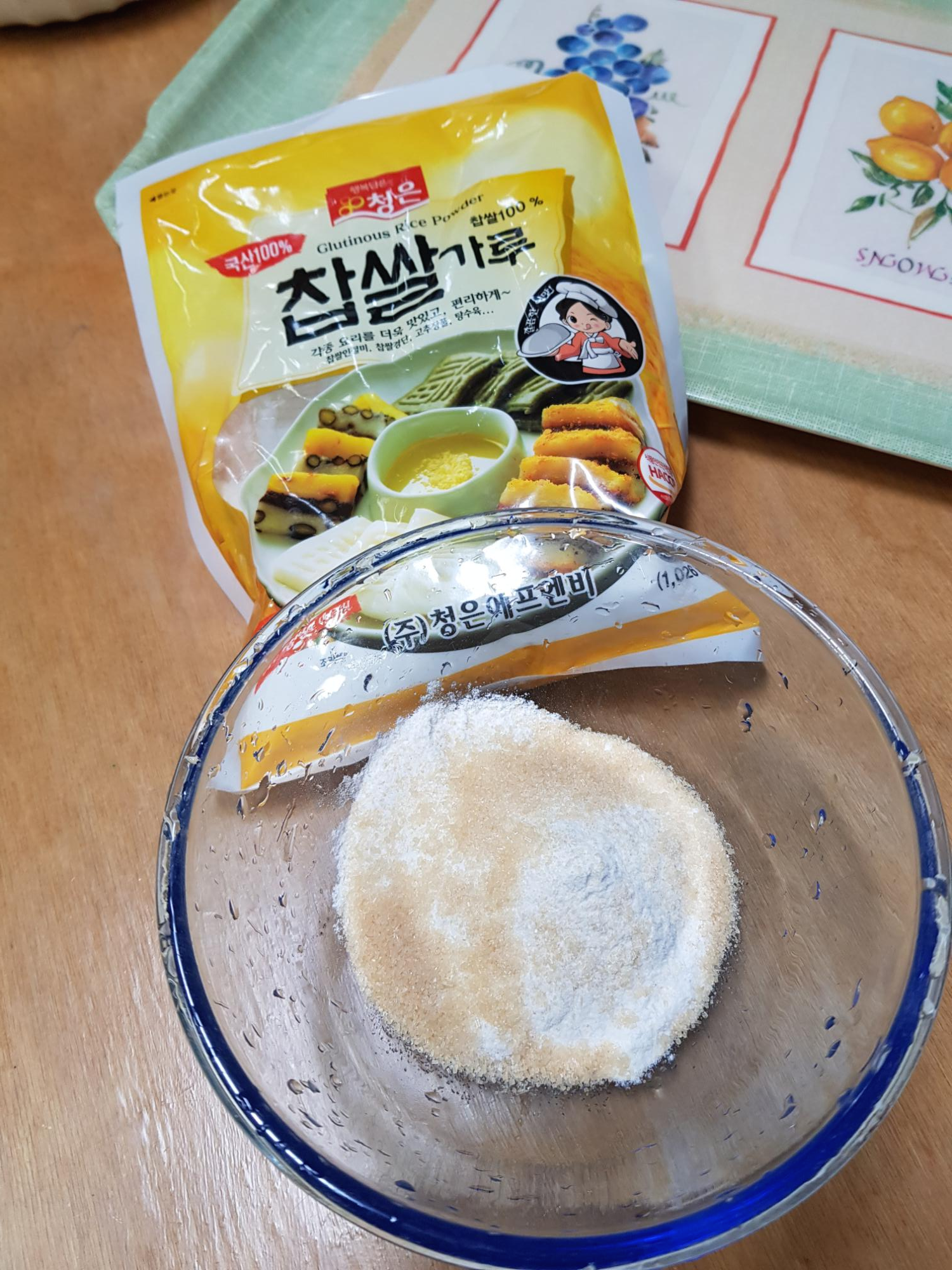 우선 찹쌀 가루를 아이 주먹으로 한 주먹 정도의 분량에 설탕을 티스푼으로 세 스푼 넣어 주고