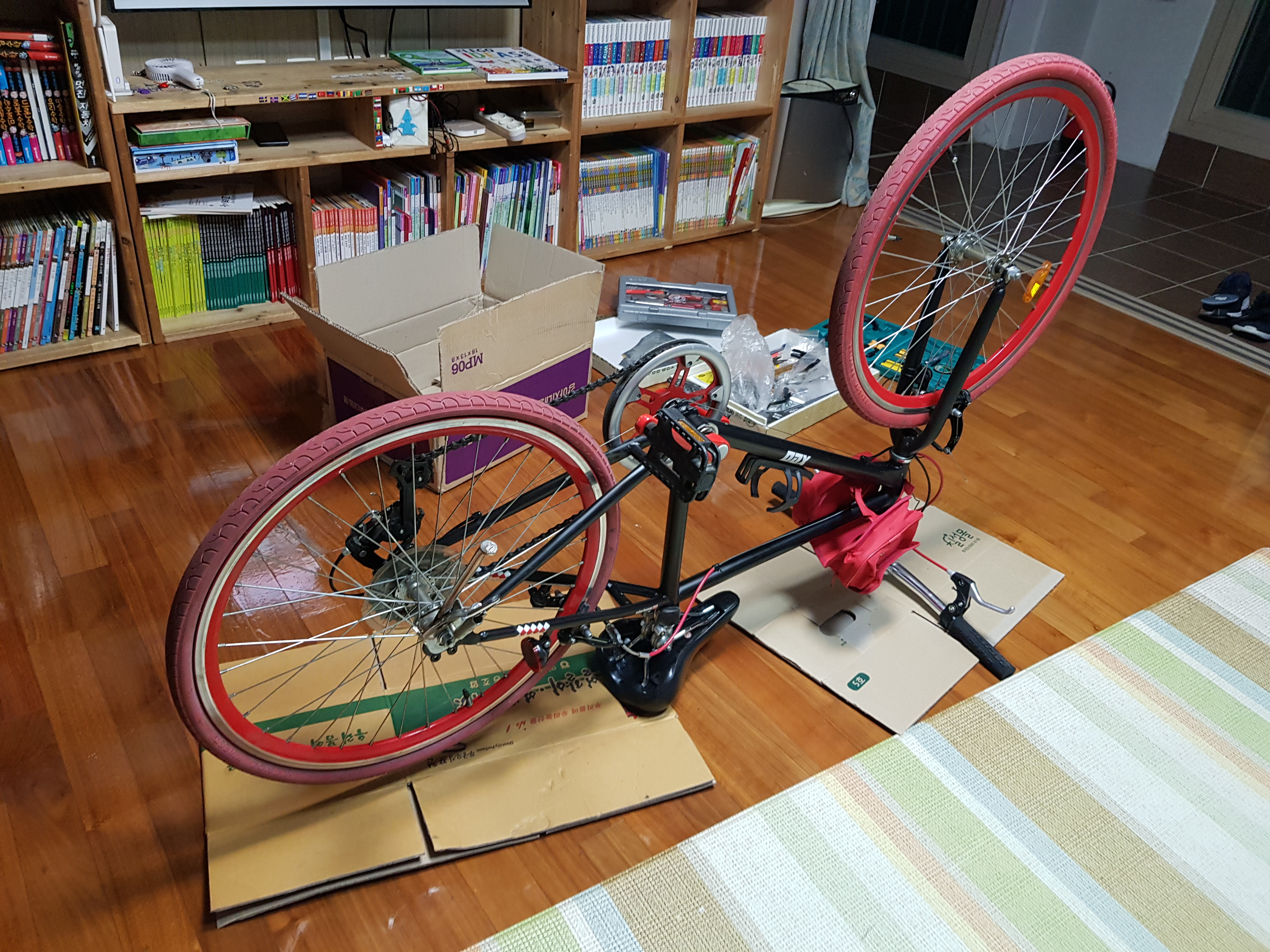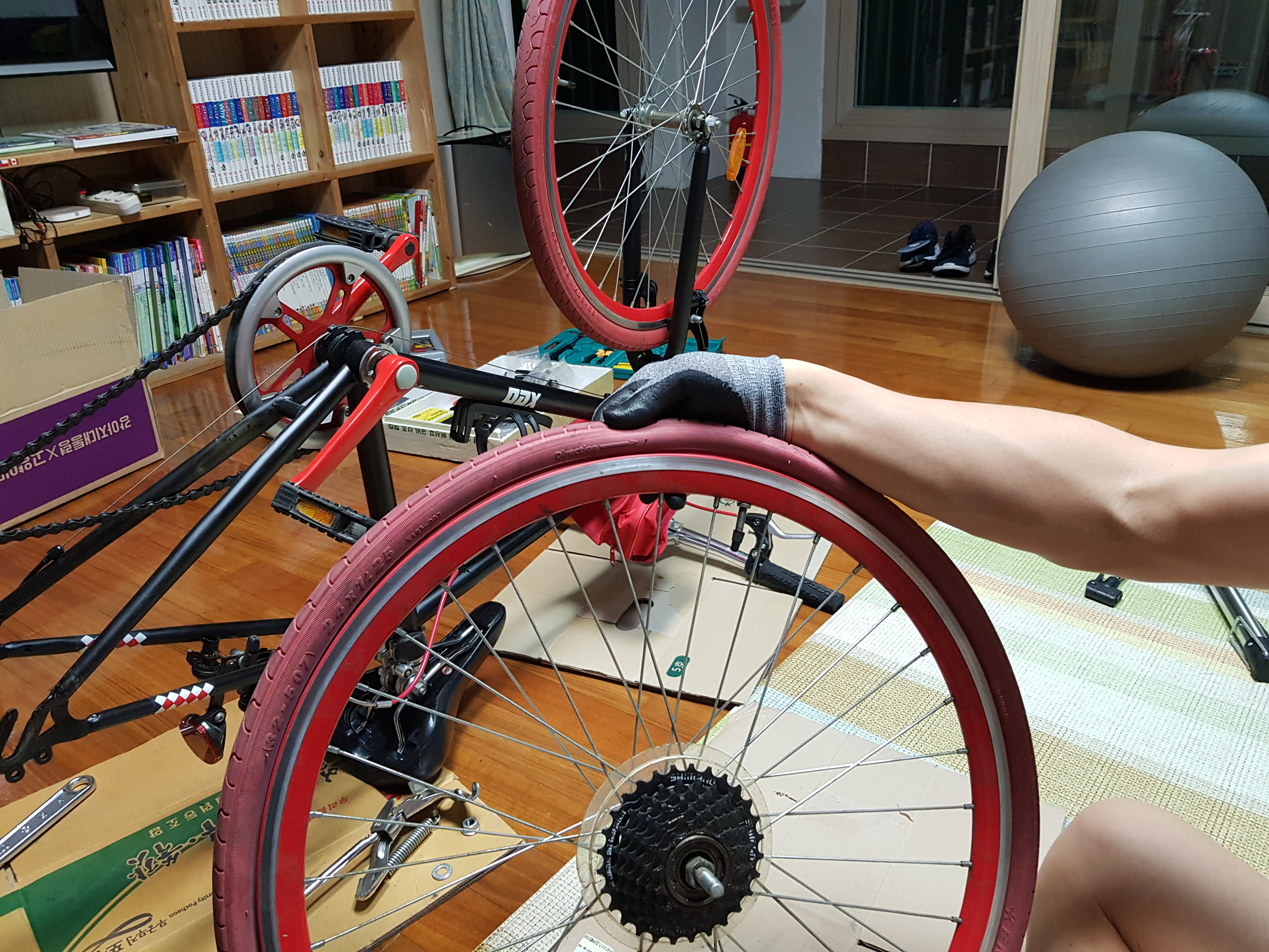 허세가 아닌 허세를 부리기 위해서라도 자전거를 뒤집어서 세워 놓고 작업을 진행한다.