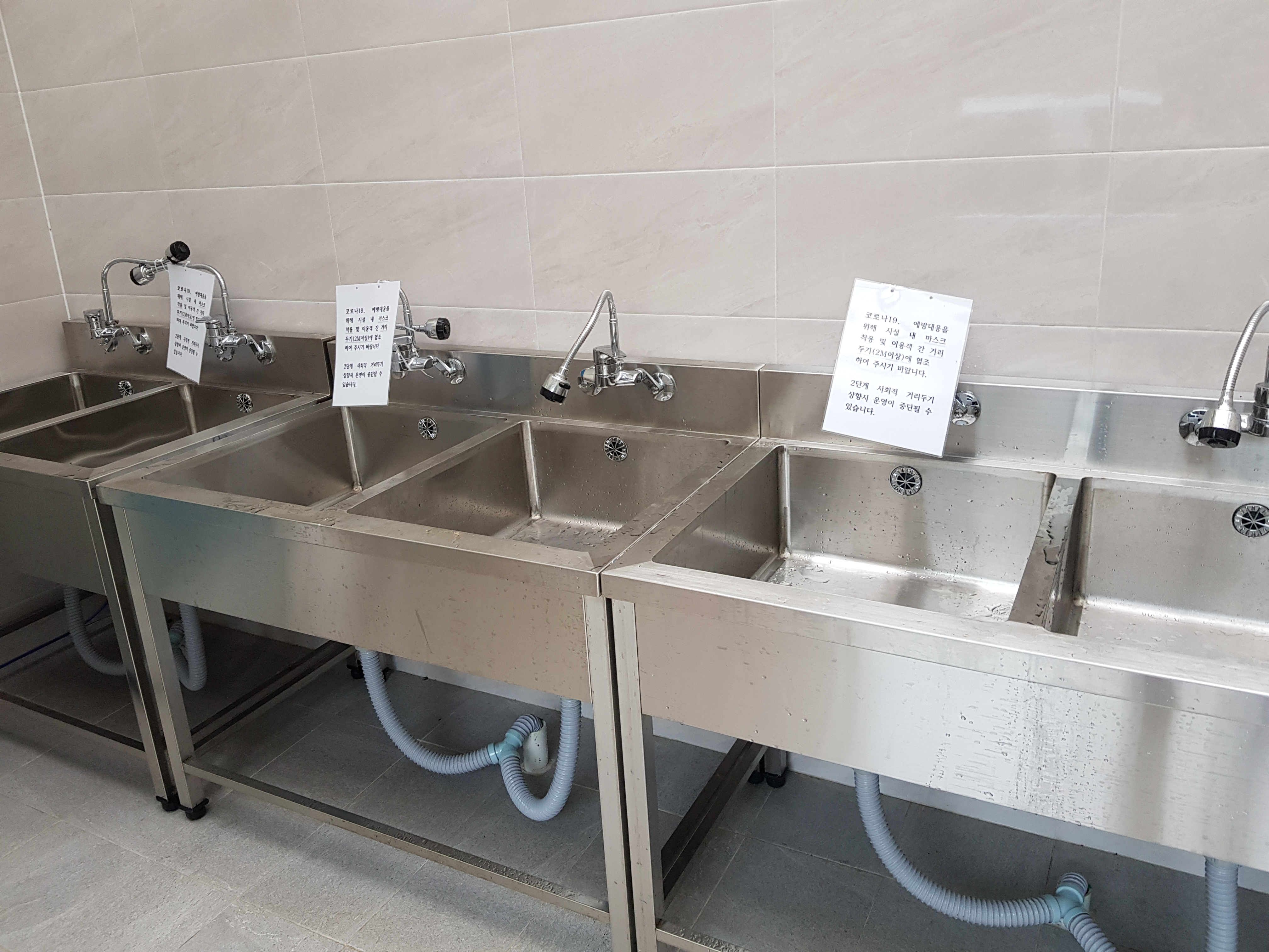 수련원 한 쪽에 개수대가 마련되어 있고, 뒤쪽으로 쓰레기를 분리할 수 있는 공간도 마련되어 있다.
