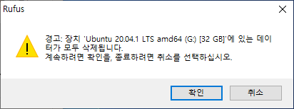 시작을 하게 되면 기존에 USB내부에 존재하고 있던 모든 정보들이 삭제 된다는 경고 창이 뜨게 된다.