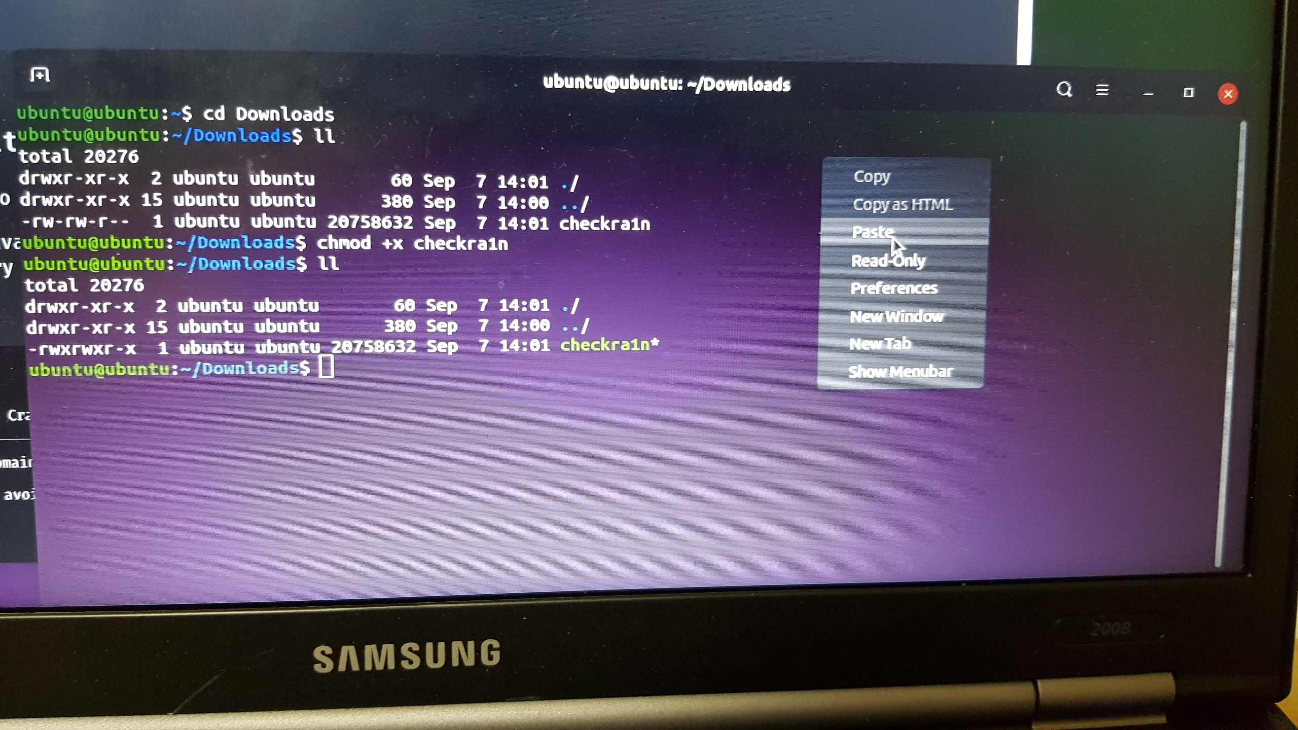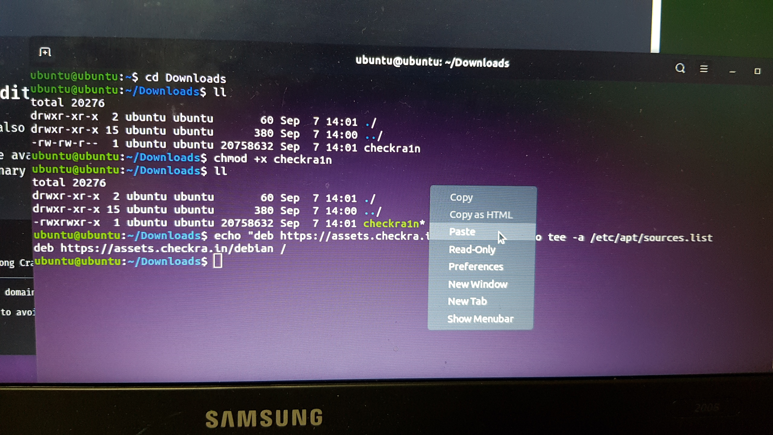 다시 터미널로 돌아와서 마우스 우클릭 메뉴의 붙여 넣기를 선택 하고 엔터를 눌러 실행한다.