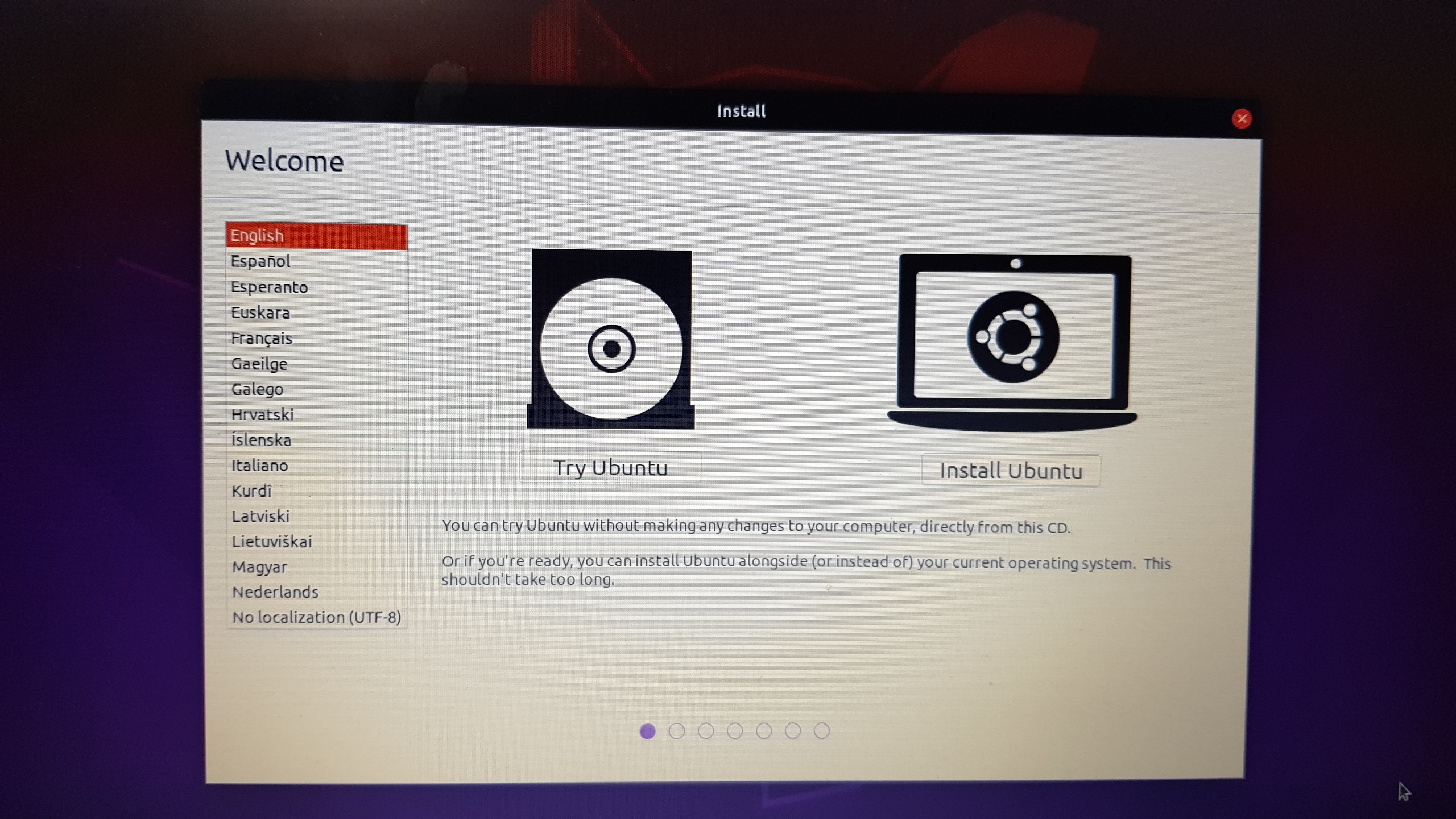 유분투가 부팅 되면서, Ubuntu를 설치 할지 단순히 사용할지 묻는 화면에서 Try Ubuntu를 선택하여 사용하기로 한다.