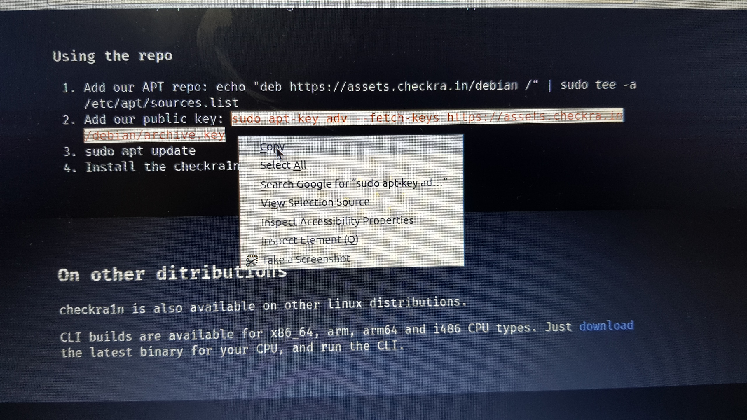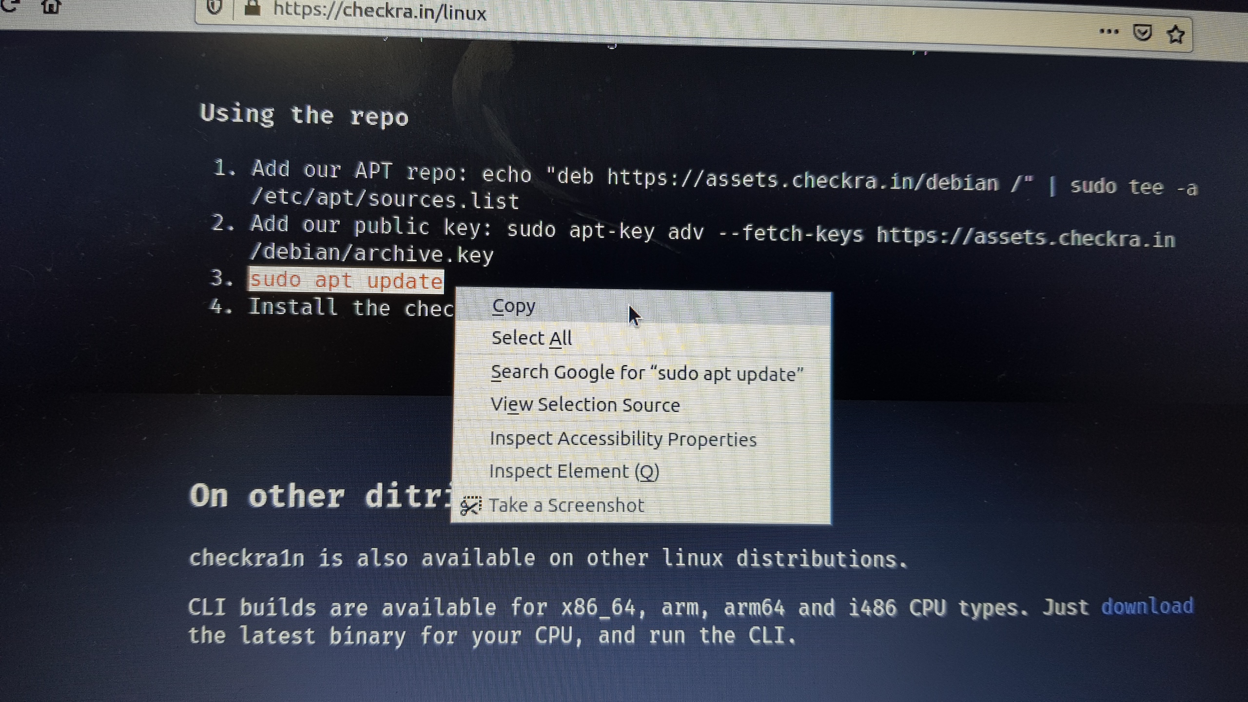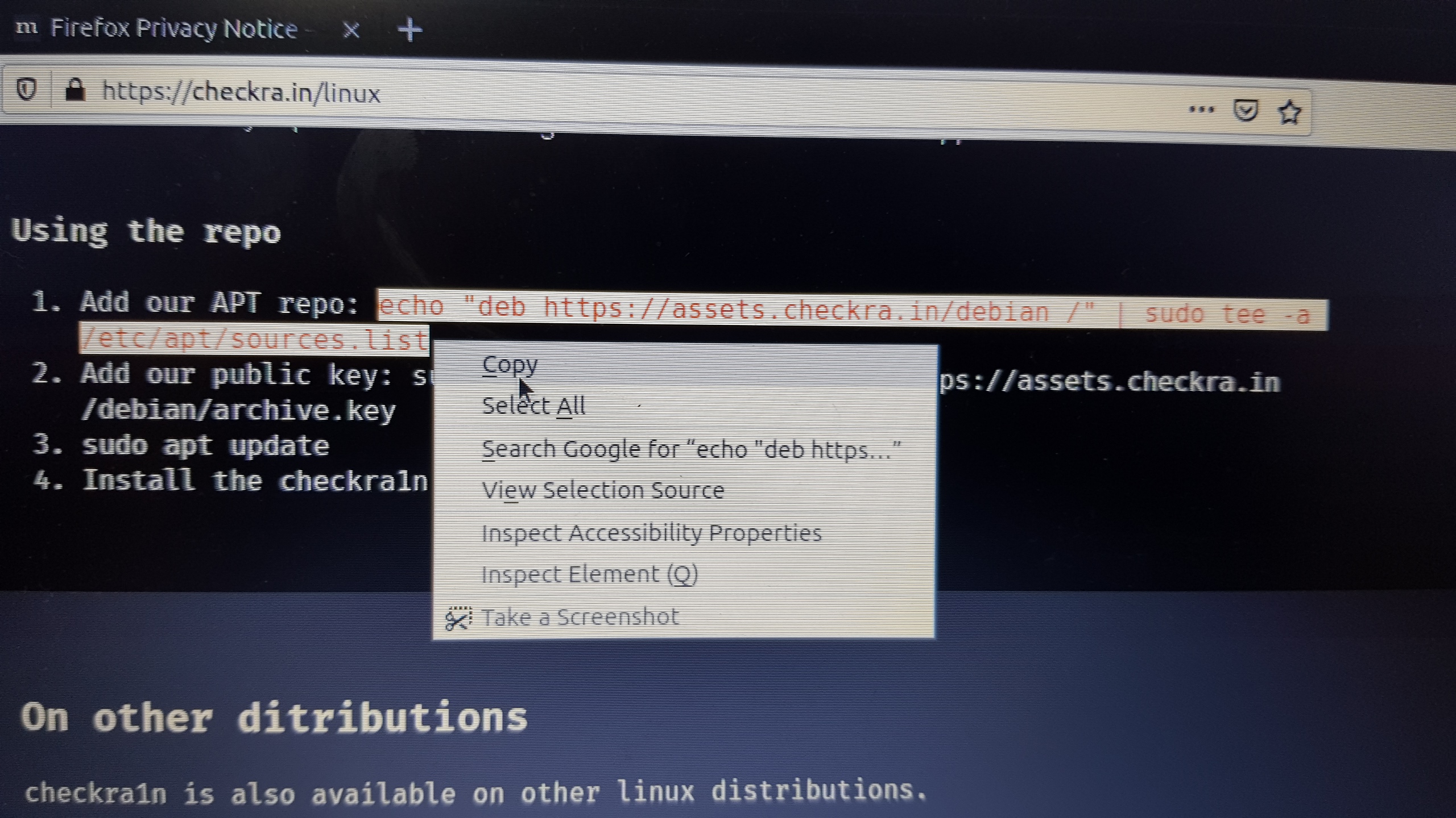 첫번째가 끝났으면 Firefox Browser에서 두번째 “sudo apt~”라인을 선택하여 복사한다.