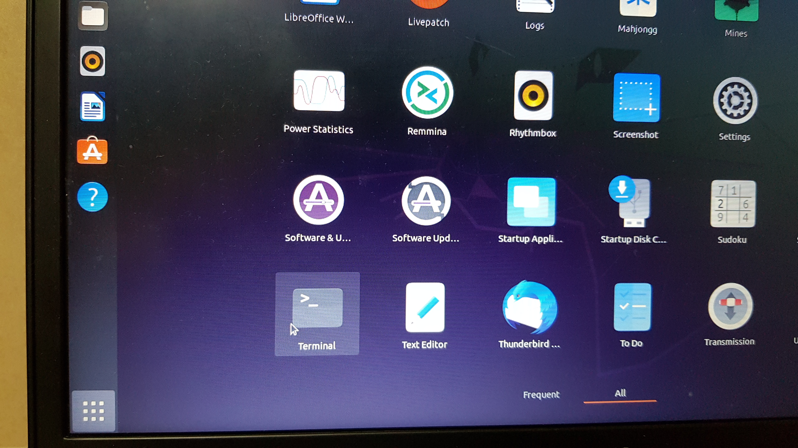다운을 받았다면 ubuntu의 좌측 하단의 응용프로그램들을 눌러 “Terminal” 프로그램을 실행 시킨다.