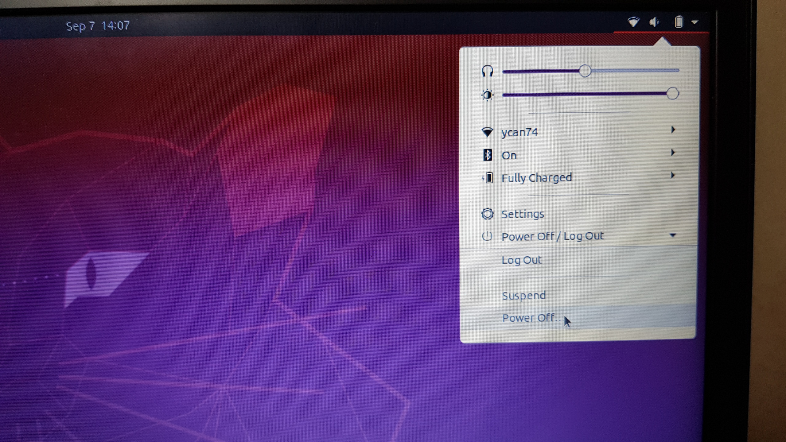 ubuntu에서는 모든 작업이 종료 하였으니 우측 상단의 메뉴에서 “ Power Off “를 선택 하여 컴퓨터를 종료 한다.