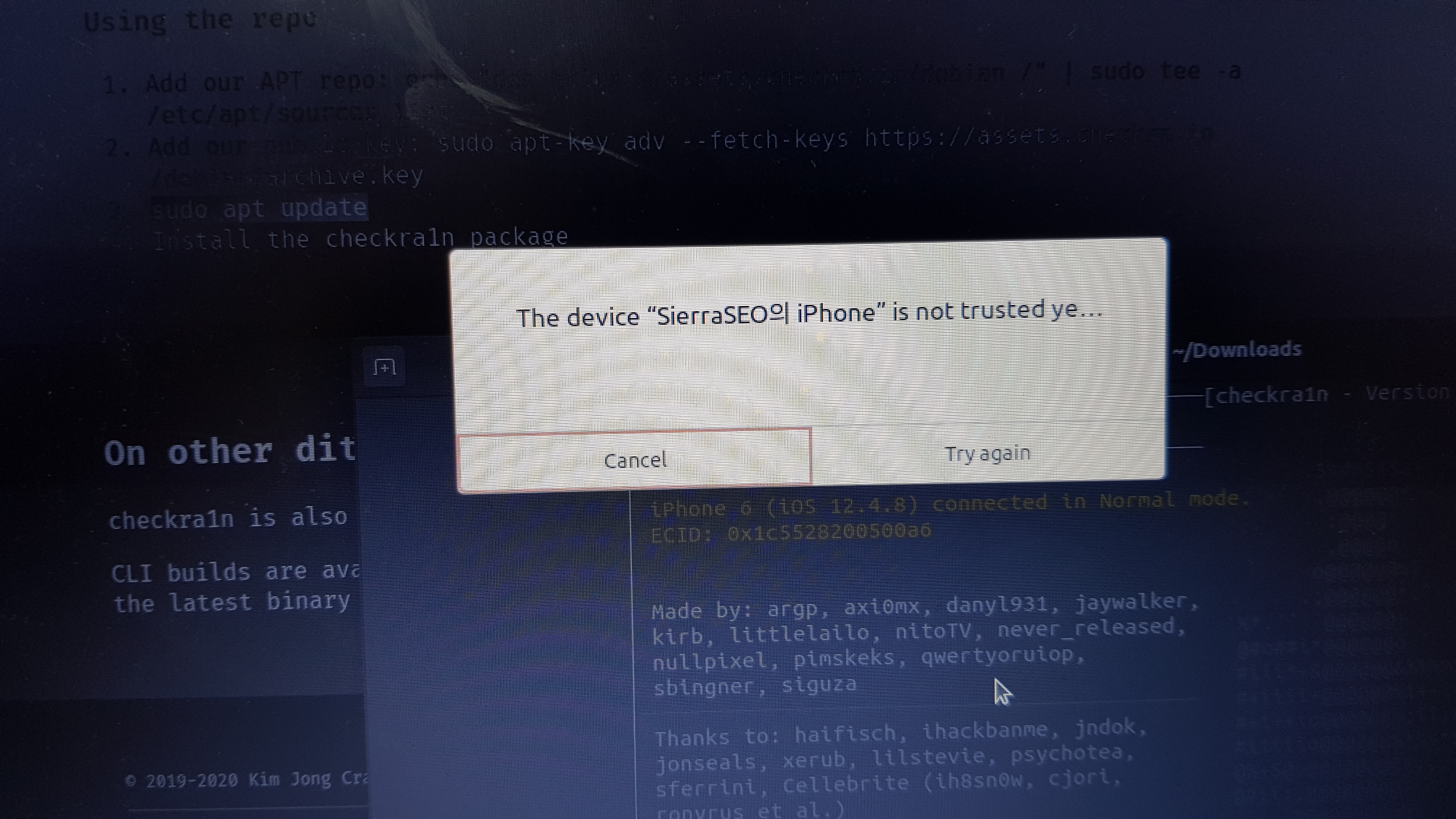 Checkra1n이 실행 되었다면 아이폰을 컴퓨터와 연결한다.