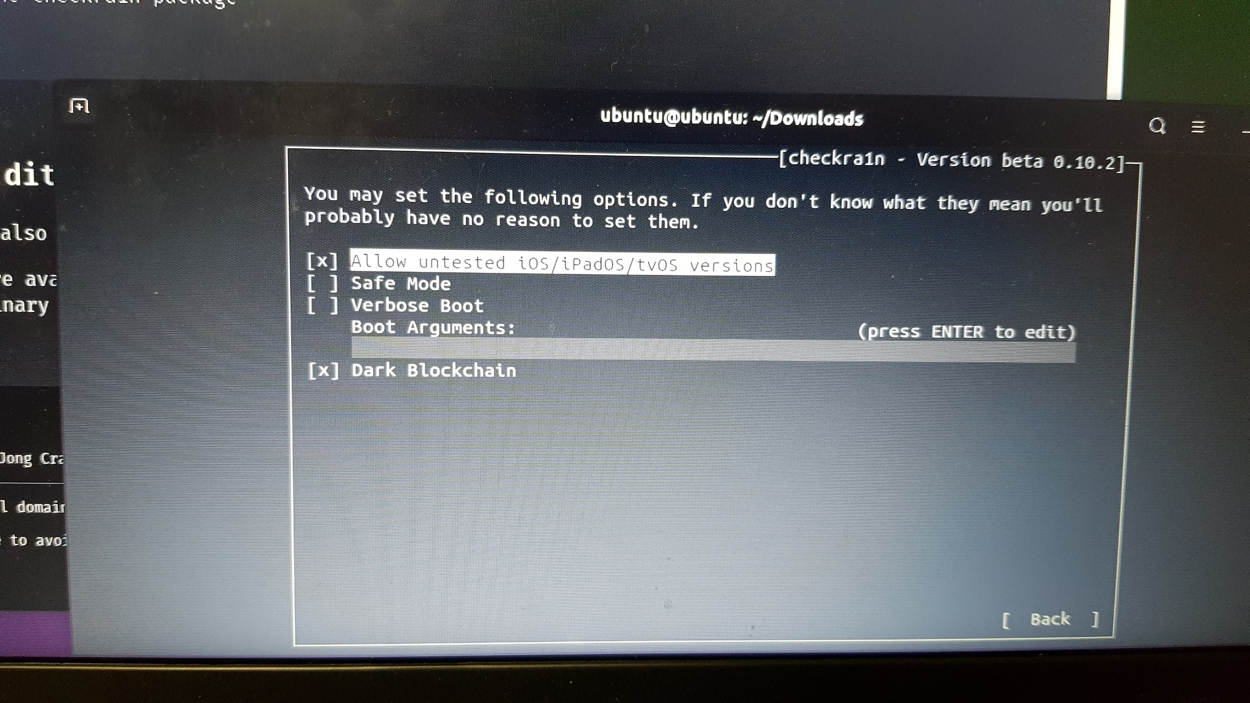 화살표(커서 이동키)를 이동하여 첫번째 “Allow untested iOS/iPadOS/tvOS version”로 커서를 이동하고 스페이스바를 눌러 선택 한다.