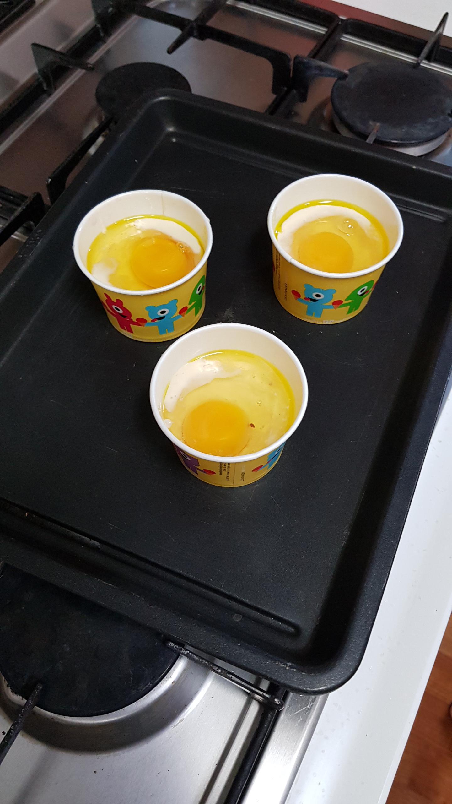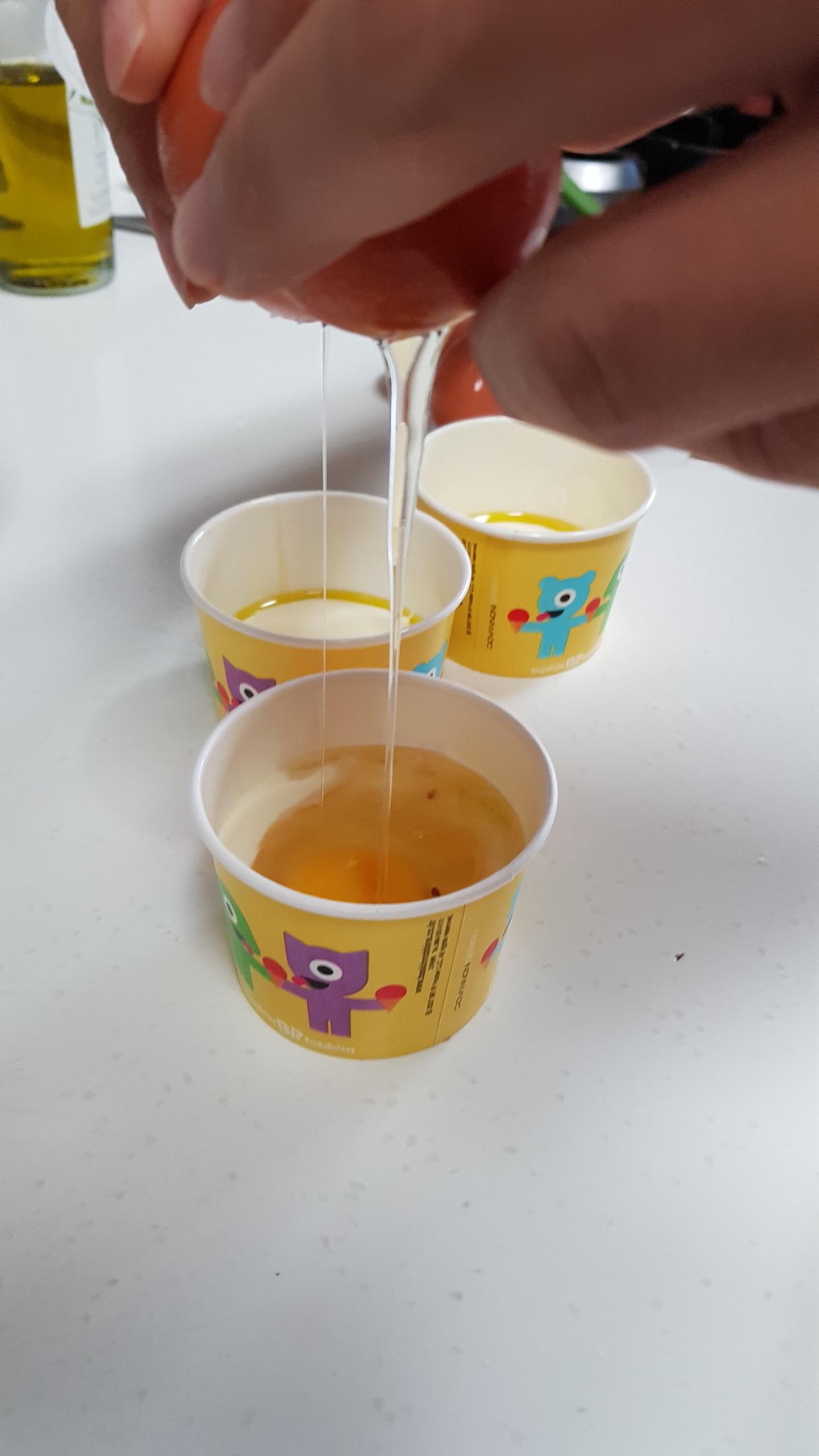 반죽이 들어간 컵에 계란 하나씩 깨서 넣는다.