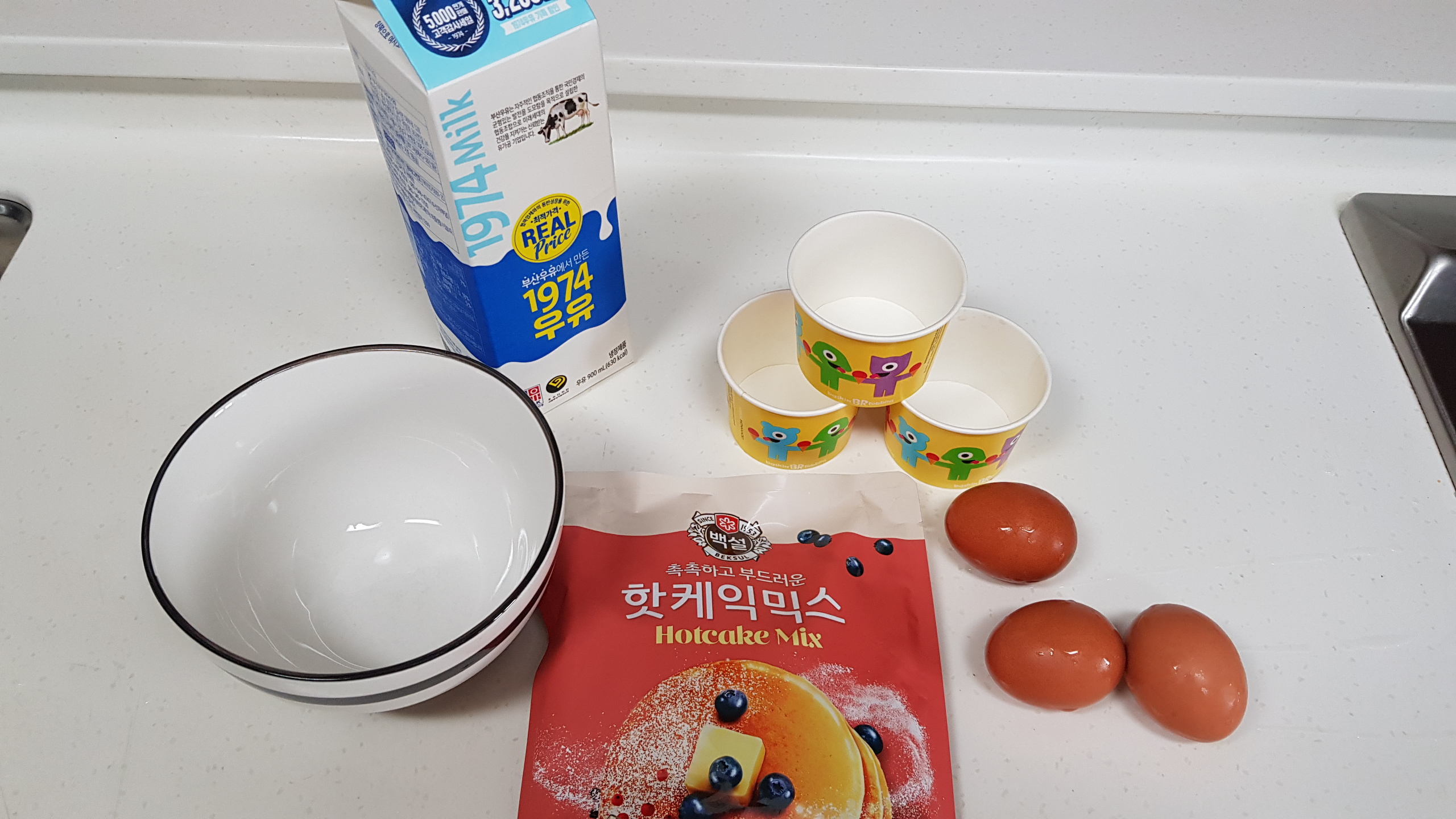 종이컵 한 컵의 핫케익가루에 반 컵의 우유를 섞으면 2 컵의 계란 빵을 만들 수 있다.