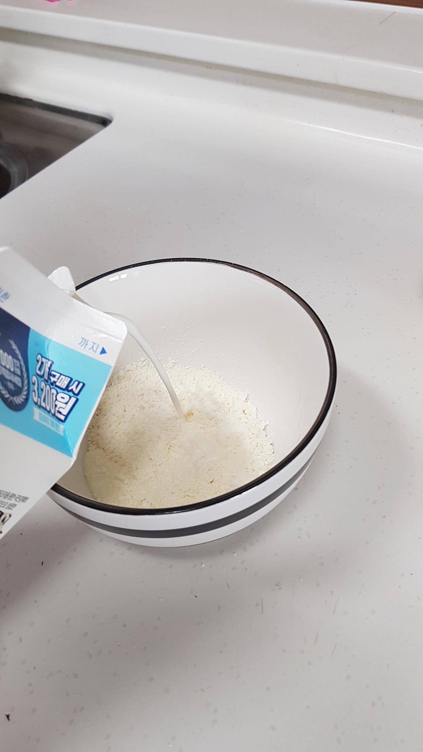 먼저, 핫케익가루와 우유를 2:1의 비율로 혼합한다.
