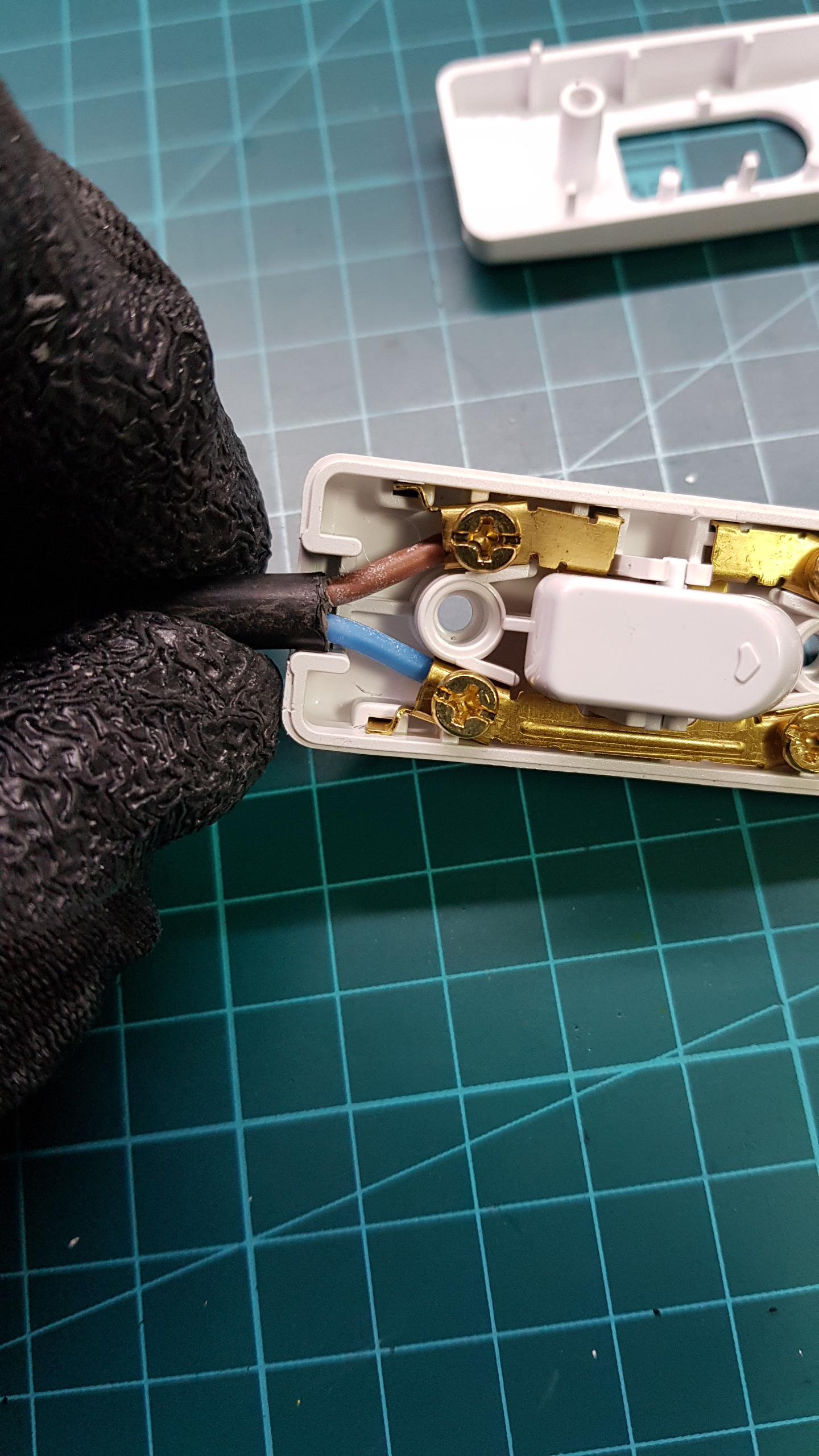 작은 On-Off 스위치 커버를 벗겨내고 한쪽에 콘센트의 전선을 연결하고 나사를 확실히 조여준다.