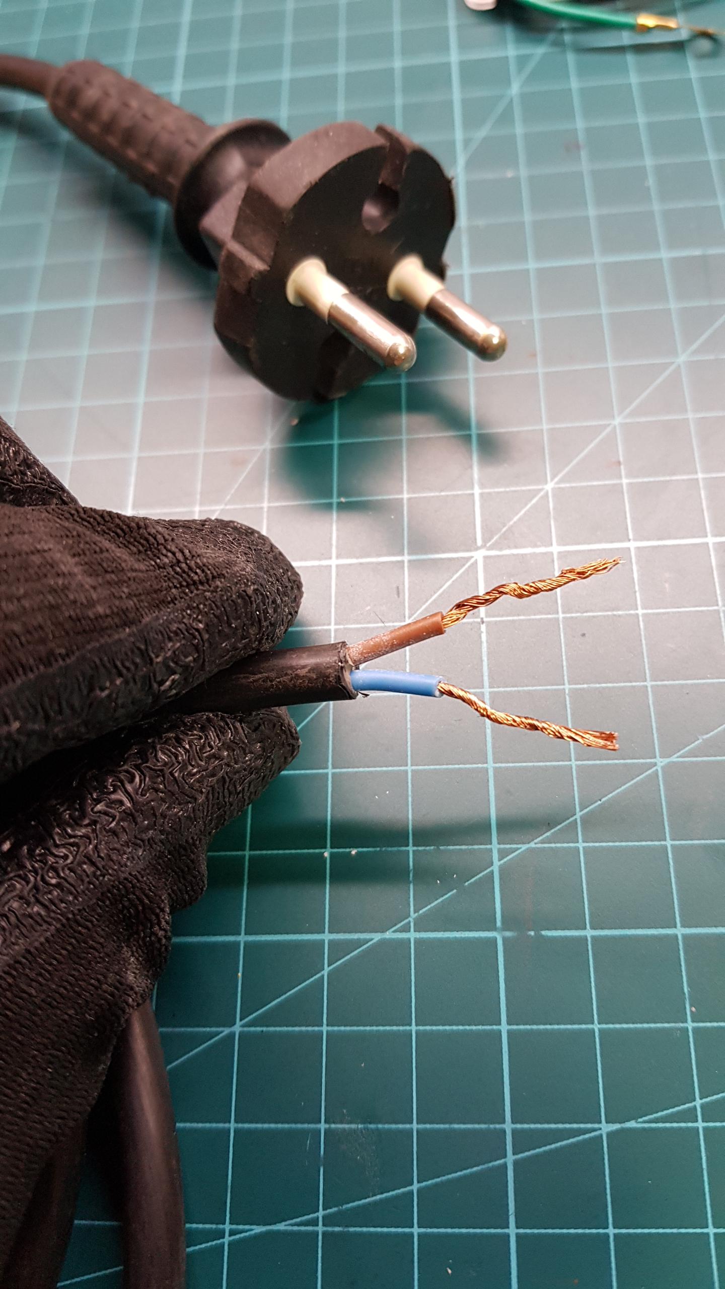 진공 청소기의 잘라진 긴 코드의 한 쪽 끝부분의 작은 전선의 피복을 벗겨내고 전선 가닥을 아름답게(?) 꼬와 준다.